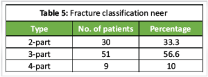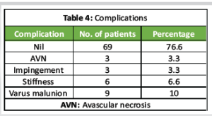 Patients with 2-part fractures had the best functional outcomes, likely due to simpler reduction and more stable fixation. Outcomes in 4-part fractures were less favorable due to the complexity of reduction and higher potential for avascular necrosis. Notably, 10 out of the 21 complications occurred in patients with 4-part fractures, underlining the technical difficulty and poorer prognosis associated with this subgroup. Complications (Table 4) 21 patients had complications. Out of which 10 patients had 4-part fractures. These were linked to avascular necrosis, impingement, varus malalignment and stiffness. No intraoperative complications, deep infections, or implant failures were reported during the study.