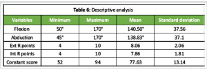 Follow-up and outcome assessment (Table 1-6). Patients were followed at 3 weeks, 6 weeks, and monthly thereafter for a minimum of 4 months. Clinical assessment included evaluation of pain, ROM, strength, and return to daily activities. Functional outcomes were assessed using the Constant-Murley score at 4 months postoperatively.