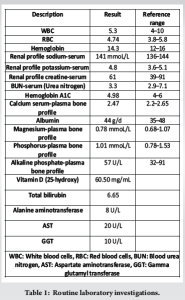 He has good quadriceps and hamstring power 5/5. No other abnormalities were detected in his upper and lower limbs. Potential biomechanical adaptations that help to maintain normal gait and joint kinematics in this patient with congenital absence of the patella, specifically mechanisms that prevent knee hyperextension. This may include strengthening or altered recruitment of surrounding musculature (e.g., hamstrings, hip flexors, gastrocnemius), and modified joint alignment or ligament tensioning within normal compare to other studies. Both static postures and dynamic loading scenarios, for example, walking and stair climbing, have been stable movements, which are normally enhance quadriceps efficiency by increasing the moment arm and increased hamstring stress due to compensatory function in absence of the patella (Fig. 5). His blood parameters of liver function test, renal function test, and bone profile and labs are all normal (Table 1). Patient’s hip joints demonstrated a normal range of movement and his ankle joints were also normal. The rest of her musculoskeletal exam was also normal. His cardiovascular, neurological, and abdominal examinations were all normal (Fig. 5). CT chest, abdomen, and pelvis showed no osseous or visceral abnormal. (Fig. 7 & 8).