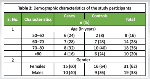A total of 50 patients participated in the study, with 25 each in the case and control groups, respectively. Each participant was randomly assigned to cases or controls using a table of random numbers.