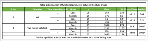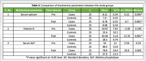 The comparison of biochemical parameters between the study groups is given in Table 3. There was a statistically significant difference in the serum calcium levels between the cases and controls before the surgery (P < 0.05) and post-surgery (P < 0.01). However, a statistically significant difference between the cases and controls was found only post-surgery with respect to Vitamin D levels (P < 0.001) and serum ALP levels (P < 0.001). On comparing the Callus Index between cases and controls, there was a significant difference in the mean Callus Index (P < 0.001) individually at 1st, 2nd, and 4th months (Table 4). Regarding the functional parameters, the mean Visual Analog Scale (VAS) scores were similar between the cases and controls at the 2nd month and at the 4th month. However, the distances covered by the two-minute walk test showed statistically significant differences (P < 0.001) between the cases and controls at the 2nd month (160.8 m and 125.9 m, respectively) and the 4th month (178 m and 144.9 m, respectively (Table 5).