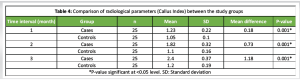 Data were entered and analyzed using the Statistical Package for the Social Sciences, ver.20 software. Descriptive data were presented as mean with standard deviation. Analytical data between cases and controls was presented using an independent samples “t” test. Analytical data within cases and controls were presented using a paired “t” test. P < 0.05 was considered statistically significant.