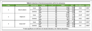 The present study showed a significant increase in serum calcium level between the TPTD and non-TPTD groups over a 2-month span. Both groups showed a significant rise in calcium at 2-month follow-up, but the mean increase in calcium was better with the TPTD group. This was mainly due to the effect of TPTD on calcium homeostasis and increased renal reabsorption. Calcium also had a direct correlation with serum albumin level . At physiological pH, about 45% of albumin is bound to calcium. Hence, in elderly patients, a higher prevalence of hypoalbuminemia may predispose to hypocalcemia. With regards to Vitamin D levels, the TPTD group showed an increase of 22.07, and the non-TPTD group showed an increase of only 4.92. This increase was statistically significant (P = −0.001) and showed the effect of TPTD to increase serum total Vitamin D levels. Serum ALP is a marker of bone turnover. The TPTD group showed a drastic increase in serum ALP levels, but they were within the normal range. There was no abnormal increase in ALP levels, warranting any suspicion of malignancy. According to studies, gains in bone mass as measured by bone matrix outpace those in mineralization. The removal of older bone with relatively high mineralization after TPTD treatment and the formation of new bone with relatively low mineralization are likely the causes of this substantially bigger increase in bone matrix compared to mineralization. The rise in freshly generated, lower mineral density bone matrix was caused by the PTH’s stimulation of skeletal remodeling [12,13].