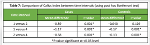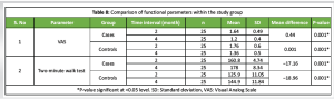 On comparing the biochemical parameters within the study group, there was a statistically significant difference in the mean values of serum calcium, Vitamin D levels, and serum ALP levels between pre- and post-surgery for both cases and controls (P < 0.001) (Table 6). On comparing the Callus Index between the cases and controls over the period, among the cases, a statistically significant difference was observed in the Callus Index between the 1st and 2nd months, 2nd and 4th months, and 1st and 4th months (P < 0.001). However, among the controls, a statistically significant difference was observed in the Callus Index only between the 1st and 4th months, and the 2nd and 4th months (P < 0.001) (Table 7). On comparing the functional parameters within the study groups, the mean difference in the VAS and two-minute walk test scores was statistically significant between the 2nd and 4th months for both the cases and controls (P < 0.001) (Table 8).