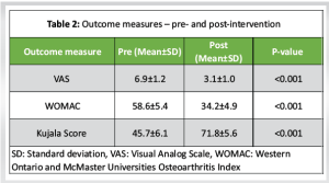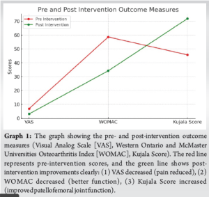 Results: Statistical analysis revealed significant improvements across all outcome parameters post-intervention. Mean VAS scores decreased from 6.9 ± 1.2 to 3.1 ± 1.0 (P < 0.001), indicating substantial pain relief. WOMAC scores showed a marked reduction from 58.6 ± 5.4 to 34.2 ± 4.9 (p < 0.001), reflecting improved joint function and reduced stiffness. The Kujala Score improved significantly from 45.7 ± 6.1 to 71.8 ± 5.6 (P < 0.001), denoting enhanced patellofemoral mechanics and functional mobility.