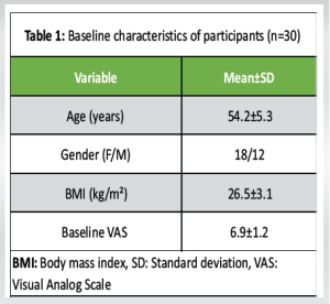 The results of this study demonstrate statistically significant improvements in all measured outcomes following the 6-week physiotherapy intervention combining MET, strengthening exercises, and patellar mobilization. The baseline characteristics show a middle-aged cohort with a moderate body mass index (BMI) and moderate pain levels, as indicated by the initial VAS score. Post-intervention analysis revealed a marked reduction in pain intensity (VAS), with scores significantly decreasing from 6.9 to 3.1, indicating effective pain relief. Functional ability, assessed by the WOMAC index, improved substantially, reflecting reduced joint stiffness and enhanced physical function. In addition, the Kujala score, which evaluates patellofemoral joint function and anterior knee pain, showed significant enhancement, suggesting better joint mechanics and mobility. The highly significant P-values (<0.001) across all outcomes confirm that these improvements are unlikely due to chance and support the effectiveness of the integrated physiotherapeutic approach in managing PFOA (Tables 1 and 2, Graph 1).