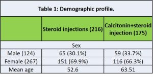 Introduction: Frozen shoulder is one of the commonest debilitating conditions with characteristic features of by pain and globally restricted range of motion of the shoulder. This study compares the efficacy of intra-articular steroids alone in comparison to the combined intra-articular steroids and calcitonin nasal spray in the management of early-stage frozen shoulder. We hypothesized that the combination therapy of intra-articular steroids and calcitonin nasal spray results in a better increase in shoulder function and superior pain relief. Along with decrease in disability in comparison to treatment with corticosteroids alone.