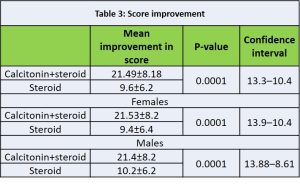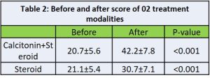 Conclusion: The combination therapy of intra-articular corticosteroids and calcitonin nasal spray was found to be more efficacious as compared to intra-articular corticosteroids alone in the treatment of early-stage frozen shoulder. This combination therapy of intra-articular steroids and calcitonin provides better pain relief and shoulder function. This decrease in disability suggests its potential as a promising treatment option in the management of patients with early frozen shoulder.