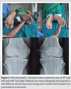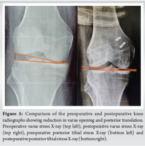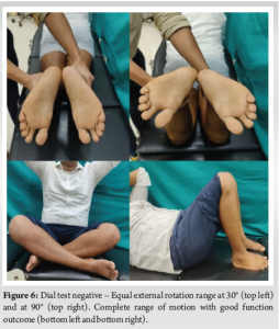 Both limbs were secured in the respective tunnels with the help of an adjustable-loop cortical suspensory fixation implant. Final tensioning was done in a limb position of 30° flexion, slight valgus, and neutral rotation. Final intraoperative stability testing showed reduced lateral opening with varus stress, and the posterior drawer was reduced to Grade 1. Postoperative radiographs showed a reduction in posterior translation and varus opening (Fig. 5). Postoperative rehabilitation involved 6 weeks of non-weight bearing, with range of motion limited to 90° for the first 2 weeks, followed by range of motion as tolerated. The patient began weight-bearing at 6 weeks along with gait training and proprioception exercises. On clinical examination at the 3-month follow-up, external rotation asymmetry was restored to normal, the varus stress test was negative and complete knee range of motion was achieved (Fig. 6). The Posterior drawer test continued to show a Grade 1 laxity, but the patient did not have any instability or symptoms of PCL deficiency. At the 6-month follow-up, the patient was walking pain-free without any limp, had near-normal squatting, and was able to carry out all activities of daily life. At the 1-year follow-up, the Lysholm score was 90/100, the International Knee Documentation Committee (IKDC) score was rank B (near normal), and the patient could comfortably engage in low-to-moderate demand sports [12,13].