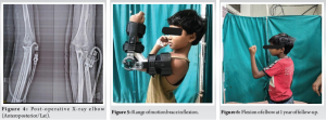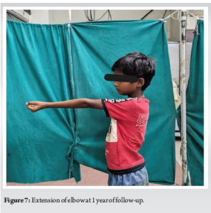 The patient was given a slab of elbow in extension for 7 days. The patient was kept on a range of motion (ROM) brace with intermittent ROM exercise (90° of elbow flexion to 180° of elbow extension) (Fig. 5) and reviewed every 2 weeks for the first 3 months and once monthly thereafter for up to 6 months, followed by once every 6 months for up to 4 years. The patient regained elbow joint movement with the flexion and extension of approximately 120° (range 0–120°). The Broberg–Morrey score was 97 of the affected limb on 6 weeks of follow-up. There was no indication of a recurrence, and the affected limb functioned normally (Fig. 6 and 7).