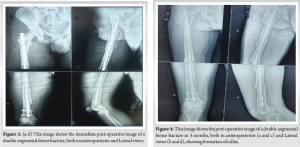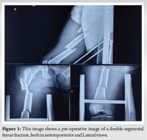 Conclusion: Double-segmental femur fractures are regarded as exceedingly uncommon injuries. Our results highlight that intramedullary nailing without a fracture table can yield excellent functional outcomes, with patients expected to achieve full weight-bearing by four months and a full range of motion thereafter.