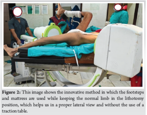 We determined that IMN was the best course of action after carefully weighing our treatment alternatives. The tibia skeletal traction was removed before the procedure, and the patient was placed under spinal anesthesia while lying supine on a standard radiolucent table. The innovative technique used was putting the patient in a supine position over the wooden footsteps and mattress, and keeping the normal limb in lithotomy position, we could get proper anteroposterior (AP) and lateral images without using the fracture table, it not only saves time which is generally used while connecting traction instruments it also helps which there are limitations or where fracture table is not available as shown in (Fig. 2). For osteosynthesis, a trochanteric antegrade nail was utilized. The required rotation and traction were manually applied intraoperatively. To insert a standardized awl into the greater trochanter’s tip, a typical lateral incision was created above the greater trochanter’s level following normal aseptic skin preparation and with the constant assistance of an image intensifier. The intramedullary guidewire was advanced to the level of the lesser trochanter. Incision was extended till the second fractured fragment, and TFL was cut to expose the fracture site. Multiple Hohmann retractors were used to align the first and second fractured fragments, which was difficult due to muscle pull at the proximal fragment and the displaced second fragment. The guide wire was passed through it till the second fractured fragment. The guide wire with a bent tip was then manipulated using a T-handle to pass through the third fractured fragment. The fourth and final fractured fragment was reduced using a bolster under the thigh, and a guide wire was passed till the superior border of the patella was centered in the coronal and sagittal planes under image intensifier guidance. Meticulous serial reaming of the femoral canal was then initiated using canulated manual reamers while maintaining reduction and rotation of fractured fragments under image intensifier guidance. After vigilant reaming, the nail was inserted into the femoral canal, followed by the timely insertion of central and peripheral screws. The patient received an additional unit of packed RBCs during surgery.