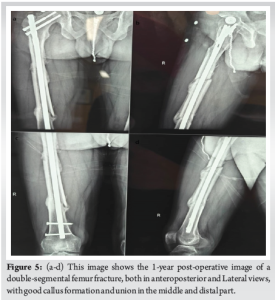 SFFs with three distinct fracture sites are extremely rare high-energy trauma injuries. Because they completely divide the bone segments, they are different from trifocal fractures [5]. Our report’s complete separation of bone cortex and malalignment makes this case even more rigorous, even though there aren’t many recorded cases of trifocal femoral fractures [6,7]. As far as we are aware, there have only been five instances of “double segmental” femur fractures documented in the body of the present literature [5,8,9]. Even though published research indicates that treating SFFs with different implants produces positive results, it only discusses situations in which femoral neck and shaft fractures coexist [10]. According to a recent study by Kook et al., [11] SFFs had a significantly higher non-union rate than non-SFFs, with residual fracture gaps and insufficient intramedullary nail canal filling being the main causes of non-union rates. In addition, a small-scale study by Liu et al., [2] indicated that combining plate fixation and IMN seems to be a successful strategy for the surgical treatment of SFFs with reduced operating time and high union rates. However, since there are so few solid results in the literature currently in publication, it is impossible to obtain reliable results in terms of the surgical treatment of double SFFs. Galanis et al., [12] in his study double double-segmental fracture showed fracture fixation using fracture table but, in our study, we showed fixation without use of fracture table with good results due to some limitations. Finally, given the complexity of these fractures and the wide range of available treatments, it is critical to emphasize that when treating double SFFs, doctors must always give patients all relevant information about the possible risks, advantages, and particular benefits of each procedure in comparison to the others. In this regard, doctors have a professional obligation to accurately explain the risks, advantages, and potential alternatives to a particular surgery while performing an informed consent process. In our instance, the patient received a thorough explanation of our team’s reasoning for the chosen course of therapy both before the procedure and throughout the informed consent procedure.
