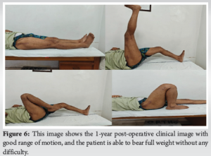 Since Hb was 8.1 g/dL and HCT was 24.5%, the patient received an additional unit of packed RBCs on the 1st post-operative day and X-ray was done as shown in (Fig. 3). On the 2nd post-operative day, in-bed turning, active quadriceps, hamstrings, and ankle pump was initiated, and on the 5th post-operative day, he was allowed to touch down while bearing weight. Using a walker, partial weight-bearing was started on the 10th post-operative day. After being admitted to the hospital for 11 days, the patient was released. During his hospital stay, no other issues were observed. He was told to attend physiotherapy sessions after being released from the hospital, and several routine follow-up appointments were planned. Bone union was assessed using both radiological and clinical parameters throughout the follow-up period, after 3 months (Fig. 4) shows good callus formation. The knee range of motion after 90 days was adequate (full knee extension and up to 115° of flexion), and callus formation was noted at the 3-month follow-up visit. Ultimately, 120 days after surgery, he was able to bear his entire weight without help. The patient cautiously resumed his pre-fracture activities after radiological evaluations at the 6- and 9-month follow-up visits showed satisfactory fracture healing. During the 12-month follow-up period, the patient was completely content with the functionality of his limbs and was able to go about his everyday activities without experiencing any problems (Fig. 5 and 6).