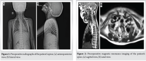 A 4-year-old boy, born to non-consanguineous parents, was evaluated and treated by a pediatrician for three episodes of dizziness lasting a few seconds, during the preceding 7 months. He gave no history of headache, nausea, vomiting, blurred vision, fever, or loss of weight. During his diagnostic work-up, however, a wedge-shaped T1 vertebra was detected (Fig. 1). He was referred to our spine surgery unit for further evaluation and management of the same. On general physical examination, no dysmorphism or cutaneous stigmata of spinal dysraphism were noted. Examination of the cardiorespiratory system and the abdomen revealed no obvious abnormalities. Neurologic examination was also unremarkable with no signs of myelopathy or radiculopathy. His blood cell counts, serum inflammatory markers, serum electrolytes, electrocardiogram, and magnetic resonance imaging (MRI) of the brain were normal.