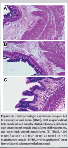 Needle aspiration of the sac was performed next to reduce its volume and facilitate excision. This procedure, however, yielded a milky-colored viscous fluid that did not appear like cerebrospinal fluid (Fig. 3b). At this point, it was evident that the lesion was not a meningocele, but more likely to be an enterogenous cyst. It was ligated at the level of its peduncle and was excised (Fig. 3c). The T1 vertebral defect was closed by fixing a small contoured maxillofacial Z-plate directly over its anterior opening. The rest of the surgery proceeded routinely. On histopathologic evaluation, the wall of the sac was found to be about 1.1 mm in thickness and was filled with mucus. The lining of the cyst comprised ciliated columnar epithelium or stratified cuboidal epithelium in different regions, overlying multi-layered smooth muscle (Fig. 4). Aggregates of mucus glands, ducts, variably sized blood vessels, benign mature adipocytes, lymphoid aggregates, and nerve bundles were found admixed with the muscular layer. No evidence of a granuloma or malignancy was noted. This confirmed the diagnosis of an enterogenous cyst. The child was advised to avoid strenuous activity in the immediate post-operative period. He recovered well and was asymptomatic with no signs of recurrence at 6 months following surgery (Fig. 5).