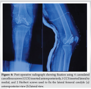 The fracture was approached through a standard medial parapatellar approach to gain access to both Hoffa fragments. The fracture site was exposed by everting the patella laterally and fully flexing the knee (Fig. 4). Anatomical reduction of the fracture fragments was obtained using 2 mm K-wires as joysticks for reduction in the distal fragments. Interfragmentary reduction clamps were deliberately avoided to prevent iatrogenic damage to the cartilage, considering the large degree of shear forces on the fracture fragments. Condylar reconstruction was done using 4 cannulated cancellous screws (7 mm), with 2 screws each passed anteroposteriorly to fix the lateral and medial femoral condyles. One additional screw was passed from lateral to medial to secure a metaphyseal beak fragment on the lateral side. The lateral Hoffa was found to have an additional fracture line, which warranted fixation with two additional headless Herbert screws (Fig. 5 and 6). The fixation construct was found to be stable throughout the knee range of motion (ROM). Post-operatively, static quadriceps strengthening alongside knee ROM exercises was started from the 3rd post-operative day with a hinged knee brace.