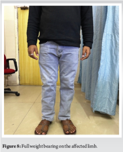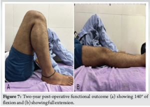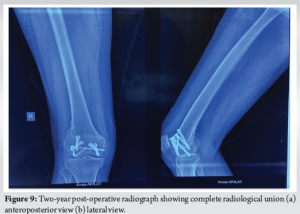 The patient was followed up in the outpatient department at 2 weeks, 6 weeks, 3 months, 6 months, 1 year, and 2 years. Toe touching weight-bearing was started at 2 weeks and gradually progressive knee ROM was allowed through the hinged knee brace. At 6 weeks, the patient had regained a ROM of 5–90° and weight-bearing to tolerance was encouraged on the affected limb alongside regular physiotherapy sessions. At 3 months, the patient had achieved a ROM of 5–100°, which further improved to 0–120° at 6 months. At 1 year, the ROM was 0–140° with full weight-bearing on the affected limb. At 2 years post-operatively, the X-ray showed complete radiological union and the patient had achieved full ROM, with no extensor lag and was able to bear full weight on the affected limb with little to no pain in the affected limb (Fig. 7 and 8).
