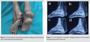 A 25-years-old male patient presented with complaints of progressive swellings on the posterior aspect of both heels and distal leg for the past 5 years (Fig. 1). Swellings were insidious in onset and were gradually progressive. The left leg swelling was painful for the past 6 months, associated with weakness of plantar flexion and antalgic gait. On clinical examination, a lobulated swelling of 9 × 15 cm was noted over the posterior aspect of the distal leg and multiple nodular swellings over both heels. Tenderness was present over the left heel. There was no local rise of temperature and there were no scars or sinuses over both heels. The right ankle has a full range of motion (ROM), whereas the left ankle has painful terminal limitation of ROM.