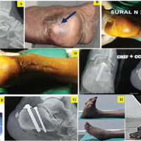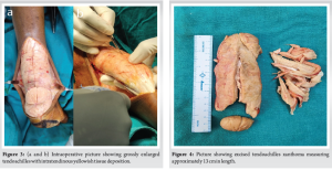 Tendon xanthomas are benign swellings of tendons, formed due to the accumulation of lipids within the tendons [1]. Tendoachilles and patellar tendons are the common sites to be involved and extensor tendons of the hands, peroneal tendons, and triceps tendons are some less commonly involved [2]. Tendoachilles xanthomas occur due to genetic defects in lipid metabolism and are usually associated with high blood cholesterol levels [3]. In general, tendoachilles xanthomas are bilateral and asymptomatic except for the uncomfortable large swellings that may cause cosmetic and footwear problems. Rarely, these swellings become painful, lead to weakness in plantar flexion and gait abnormalities [2]. Most of these cases are managed non-operatively with analgesics, lipid-lowering drugs, such as statins and physiotherapy/exercises. Cases not responding to medical management are treated surgically with subtotal excision and repair or complete excision of the tendoachilles xanthoma, followed by reconstruction of the defect with tendon or fascial grafts or tendon transfers. Commonly used grafts for reconstruction include semitendinosus tendon, tensor fascia lata, peroneus brevis tendon transfer, and flexor hallucis longus (FHL) tendon transfer [2,4-6]. The authors present a case of bilateral tendoachilles xanthoma with gouty infiltration, with reconstruction with ipsilateral long FHL tendon transfer [7].