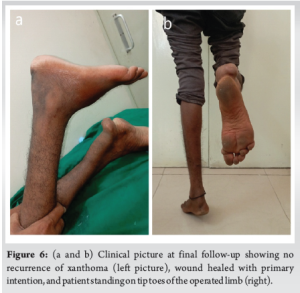 Conclusion: Complete excision of the xanthoma and reconstruction of the defect is associated with reduced recurrence rates and complete functional restitution. Reconstruction with ipsilateral FHL tendon transfer is a reliable and effective procedure offering a good functional outcome without any complications.
