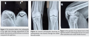 Albert Hoffa gave an initial acknowledge of this kind of fracture in the year 1904. Hoffa fractures are coronal plane fractures of the femoral condyle and are particularly rare in adolescents [1]. A non-union happens when healing or repair is not complete in an expected period of time and there is no visible healing signs for the past 3 months [2]. Hoffa fracture is very rare and incidence merely accounts for 0.65% of all types of distal femoral fractures [3]. Their diagnosis can be challenging due to inconspicuous findings on standard radiographs. Computed tomography is crucial for confirmation. According to many relative literature, they show the incidence of fracture of the medical condyle is higher than the lateral condyle [3] and occur due to high-energy trauma involving shear forces. Treatment options vary, and no consensus exists on the optimal surgical approach or fixation method. Non-union of Hoffa’s fracture is an exceedingly rare complication and often results from missed diagnosis, inadequate fixation, or conservative treatment. In young adults, non-union presents a significant management dilemma due to the dual concerns of joint preservation and long-term functional outcome. Various case reports have suggested that fractures should be treated with debridement and open reduction and internal fixation (ORIF) [4] remains the standard of care, advanced degenerative changes and chronic instability may necessitate arthroplasty as a salvage procedure. This article presents a rare case of a 38-year-old male with a non-union lateral Hoffa’s fracture managed successfully with total knee arthroplasty (TKA), highlighting the clinical decision-making and surgical outcomes.