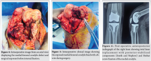 After discussing treatment options, including revision fixation, osteotomy, and arthroplasty, and given the chronic nature of the injury and degenerative articular changes, the decision was made to proceed with TKA. The procedure was performed under spinal anesthesia with full aseptic and antiseptic precautions. After painting and draping, a standard medial parapatellar incision was made. Bone cuts were taken as per protocol. Intraoperative findings revealed a fibrous non-union with articular surface damage (Fig. 4 & 5). The medial condyle non-union was exposed, debrided, and fixed using a Heibat screw for stable internal fixation.
