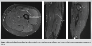 - 9.Lempainen L, Kosola J, Valle X, Puigdellivol J, Ranne J, Orava S, et al. Chronic and recurrent rectus femoris central tendon ruptures in athletes: Clinical picture, MRI findings, and results of surgical treatment. Orthop J Sports Med 2021;9:2. [Google Scholar]