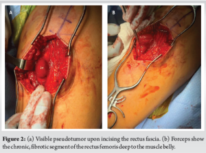The patient had already failed over 1 year of conservative management and was entering her senior season. Surgical options were discussed; the patient elected to proceed with surgery with the goal of playing her final collegiate softball season. She was consented for left rectus tendon repair, scar excision, and LFCN neurolysis. In pre-operative holding, the pseudotumor was marked while the patient was performing a squat to accentuate the small mass. The incision was centered over this region and measured 10 cm in length. Dissection was performed over the anterior fascia. Branches of the LFCN were carefully dissected, and neurolysis was performed to mobilize the nerve branches away from the pseudotumor. Upon making the longitudinal anterior fascial incision, the pseudotumor was encountered on the deep surface of the quadriceps musculature (Fig. 2).