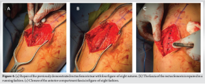 The fibrous mass was excised (Fig. 3) and deep tendon was repaired in side-to-side fashion with #2 Ethibond suture, allowing the prior mass to lay flat (Fig. 4). The wound was irrigated and #1 Vicryl was run along the anterior fascia (Fig. 4), taking care not to capture LFCN branches. Skin was closed in layered fashion. Dry dressings and knee brace were applied. Postoperatively, she was allowed to weight bear as tolerated in a total range of motion (TROM) brace locked in full extension.