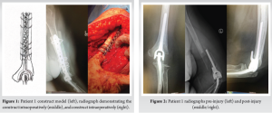 TEA has become increasingly common in recent years due to expanding indications [1,2]. As previously mentioned, these include: post-traumatic osteoarthritis, acute distal humerus fractures, distal humerus non-unions, and reconstruction after tumor resection [1-7]. Expanding indications for TEA has resulted in an increased prevalence of this procedure, leading to increased need for revision surgeries [2,3]. Up to 13.5% of total elbow arthroplasties require revision at some point [5]. Many complications leading to implant failure have been documented, the most recognized of which include implant loosening, periprosthetic fracture, implant failure, infection, triceps repair failure, and nerve palsy. Aseptic loosening may account for up to 38% of revisions, deep infection 19%, and periprosthetic fractures 12%. While aseptic loosening rates are lower for linked prostheses, there is no difference in infection and periprosthetic fractures between linked and unlinked prosthesis [5]. Data indicates that the majority of periprosthetic fractures occur in the setting of pre-existing loosening and the majority of prosthesis is loose at the time of revision [12]. Periprosthetic fractures around total elbow arthroplasties provide many unique challenges. Patients who experience periprosthetic fractures typically have poor bone quality, resulting in challenging management options. The elbow is a non-weight-bearing joint; therefore, principles of the hip and knee are not directly applicable. This is due to the fact that the elbow undergoes relatively more torsional load; thus, prioritizing torsional stability is essential in TEA. Many techniques for revision of periprosthetic fractures of the elbow have been proposed, depending on factors, such as bone quality, remaining bone stock, location of fracture, and stability of the prosthesis [4,8-10,12,13]. Strut allografts are useful particularly in the upper extremity where bone stock is limited [13]. Sanchez-Sotelo et al. [9], 2002 describe 11 periprosthetic fractures around a loose humeral component treated with revision arthroplasty and strut allograft augmentation, which resulted in high union rates and implant survival. Admittedly, these studies had 4 out of 14 patients demonstrate non-union, persistent loosening, or recurrent fracture, leaving room for improvement [9]. Alternatively, angle plate stable osteosynthesis may be utilized with or without evidence of prosthetic loosening, which was demonstrated in Fang et al., 2017 [10]. In cases of insufficient bone stock, strut augmentation with osteosynthesis may be the best option [11]. Finally, tumor prosthesis can be utilized as a last resort [9]. Our cases demonstrated two displaced periprosthetic distal third humeral shaft fractures without loosening. Due to the stability of the implants, treatment included ORIF utilizing a limited contact dynamic compression plate in the posterior position with medial and lateral cortical strut allograft augmentation and implant retention. No revision of either prosthesis was performed. Although one of the patients had limited follow-up, both achieved a functional range of motion without hardware failure.