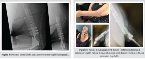 At 6 weeks post-operatively, the patient’s incision was nicely healed with minimal swelling. Range of motion was 15° short of full extension, with flexion up to 130°. There was no restriction of pronation or supination. Anteroposterior and lateral X-ray views showed good alignment and no signs of hardware failure. Unfortunately, the patient was unable to complete subsequent follow-up due to death from unrelated reasons. See Fig. 2-4.