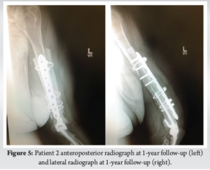 At 5 months, the patient’s incision was healed nicely. They were able to achieve 20° short of full extension and flex up to 120°. Pronation and supination were near the full range of motion. Sensation was intact with 5/5 strength in wrist, finger, and thumb extension. Anteroposterior and lateral X-rays showed proper consolidation of the fracture. At 1-year follow-up, the patient was able to use her arm and did not note any new problems. The left arm showed well-healed incisions with a similar functional range of motion. Anteroposterior and lateral X-rays confirmed proper consolidation of the fracture (Fig 5).