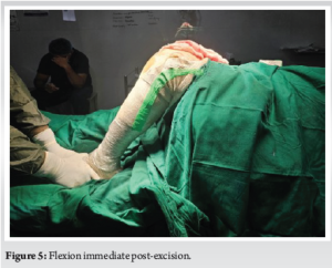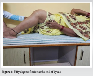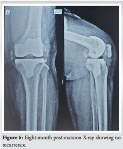 The patient underwent conservative management with regular physiotherapy to maintain joint mobility and analgesics for pain relief. Surgical excision of the ossified tissue was not performed to allow HO to mature. Gradual improvement in knee function over the following months was observed. At 1-year follow-up, full knee extension was obtained; however, restricted flexion was present with no significant improvement observed (Fig. 3 and 4). The patient was advised to undergo excision at the end of 1 year. Following excision, radiotherapy with a single cycle of 75cGy was given in the immediate post-operative period. Chemoprophylaxis with indomethacin 75 mg given once daily for 3 months and discontinued. The wound healed well, and the patient showed symptomatic improvement with a 20° increase in ROM during the initial post-operative period (Fig. 5). At 8 months post-excision, there is no radiographic evidence of recurrence (Fig. 6), and the range of knee flexion has further improved to 80°. The patient remains symptomatically more comfortable following the excision.