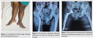 On examination, previous scar marks were visible over the hip and thigh, tenderness was present over the anterior joint line, and joint movements were restricted compared to the contralateral hip. Shortening of four cm was present over the right lower limb (Fig. 1). Radiograph of pelvis anteroposterior view revealed right dysplastic hip (Crowe’s type IV) with deformity over the shaft of the femur. Overriding of the greater trochanter and destruction of the femur head were noticed (Fig. 2). Further investigations were done, including computed tomography of the pelvis with bilateral hip and right femur for surgical planning. The patient was planned for subtrochanteric osteotomy plus THA.