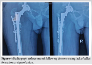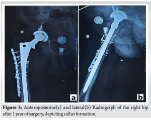 With the patient in left lateral decubitus position, the hip joint was exposed through a direct lateral approach extended distally (Hardinge technique). The incision was started at 5 cm proximal to the greater trochanter and extended distally to 10 cm below the greater tuberosity. Serial acetabular reaming was done, followed by cementless acetabular cup placement and fixation using two acetabular screws. Serial femoral broaching was done, and a long stem was used for the femur. Reduction was difficult due to the proximal migration of the greater trochanter. Hence, to aid the reduction, a subtrochanteric osteotomy was performed. The femur was exposed laterally, and subtrochanteric osteotomy was done using an osteotome and oscillating saw at the site of maximum deformity. Osteotomy site was fixed using a ten-hole locking compression plate laterally, fixed proximally and distally to the osteotomy site using 18G Stainless Steel wire, and a long stem femoral implant (solution stem) was used. Intramedullary fit was assessed using fluoroscopy. Range of movement and stability of the implant were assessed before closure. Post-operative radiograph showed signs of a well-positioned implant (Fig. 3). Post-operatively, range of movement and strengthening exercises were started the next day. The patient was started on painkillers. Low molecular weight heparin was administered for 7 days, and Apixaban 2.5 mg twice daily was continued for 3 months to prevent deep vein thrombosis. The patient was mobilized after three months of surgery. However, it was ensured that the range of movement and strengthening exercises were carried out. Initially, the patient was advised to perform hip abductor and core strengthening exercises. The patient was first followed up at 14 days of surgery for stitch removal, and then followed up at each month. Serial radiographs were done, and the wound condition, movement, and functions of the joint were assessed at each follow-up. At 3 months of follow-up, the patient still complained of pain in the right thigh and difficulty in movement. Furthermore, there were no radiological signs of healing (Fig. 4 for Radiograph). Hence patient was administered injections of orthobiologics to improve healing. The patient was given a BMAC injection at three months after the surgery, as the osteotomy was suspected to progress to non-union. The patient also received three doses of PRP injection at 4 months after surgery, 8 months post-operatively, and 10 months after surgery. All injections were given in a minor theatre, under all aseptic precautions with autologous preparation of BMAC and PRP. BMAC was prepared after aspiration of bone marrow and after centrifugation in the centrifuge machine. BMAC was injected into the fracture site. PRP was prepared after the collection of 30 mL of blood from the antecubital vein. Centrifugation was done, and the PRP prepared was activated with the activator, and the PRP was injected into the fracture site. The patient was then followed up at 1 year from the date of surgery. The patient has significantly improved results and was able to carry out daily activities. Radiograph also showed significant improvement in terms of callus formation (Fig. 5).