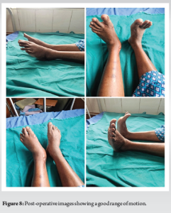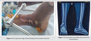 Following surgery, the patient received IV antibiotics for 5 days and oral antibiotics for 1 week. The wound healed satisfactorily (Fig. 5 and 6). She was kept non-weight bearing for 8 weeks. Serial radiography revealed bony union. The ankle-spanning external fixator with Schanz pins in the tibia and calcaneum and the fibular wire was moved after 2.5 months (Fig. 7). After 3 months, the patient was able to resume everyday activities and walk independently (Fig. 8). Her American Orthopedic Foot and Ankle Society score was 86, indicating a favorable functional result.
