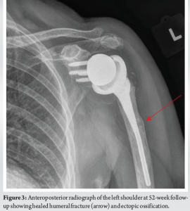 Conclusion: This is the first reported case of deformation of a humeral stem in a shoulder arthroplasty. Nonoperative management was successful for fracture healing.