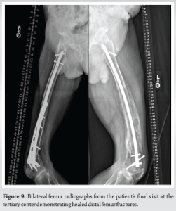 During the patient’s next follow-up visit, 1 month later, the patient complained of palpable hardware around his right knee. Repeat radiographs revealed a hypertrophic non-union with proximal migration of the nail and loosening of the distal interlocking screws (Fig. 5). He was initially treated conservatively; however, symptoms persisted for over 2 months. He then underwent removal of the right distal interlocking screws, augmentation with plate and screw fixation, and revision of the proximal interlocking screws. In a subsequent follow-up 3 weeks later, the patient noted a palpable mass around his left distal thigh. In addition, he developed a sacral decubitus ulcer that required referral to outpatient wound care. Conservative treatment with repeat imaging in 2 months was planned; however, the patient was lost to follow-up. The patient presented to the clinic 1 year later with complaints of palpable distal thigh masses bilaterally and feelings of heaviness in his legs. Radiographs revealed bilateral fracture healing with heterotopic ossification on the left, a well-fixed distal femur plate on the right, and no hardware failure (Fig. 6 and 7). The prominent left-sided heterotopic ossification and palpable right-sided distal femur plate caused significant discomfort. These complications greatly decreased his quality of life and caused him extreme distress. He was referred to a tertiary center for a second opinion, where radiographs revealed bilaterally healed distal femur fractures (Fig. 8 and 9). Removal of the right distal femur plate, left intramedullary nail, and left TTC nail was recommended to improve his quality of life. Unfortunately, the patient passed away from causes indirectly related to his orthopedic injuries before any further follow-up or surgical interventions could take place.