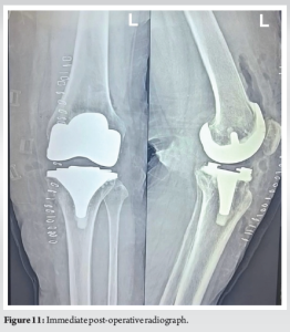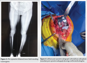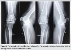 An 80-year-old female presented to our outpatient department with bilaterally painful knees, diagnosed to have bilateral tricompartmental knee osteoarthritis (Fig. 1 and 2) without any comorbidities. The patient was operated for bilateral TKR in staggered manner 2 weeks apart with the left side being operated first. Both the knees were operated with Zimmer-Biomet CR vanguard prosthesis with 10 mm polyethylene insert being used on both the sides (Fig. 3 and 4). The post-operative course was uneventful with patient achieving full range of motion (ROM) 0–120°. The follow-up of the patient at 3 and 6 months was unremarkable as well, with patient being able to carry out her daily activities unassisted.