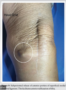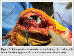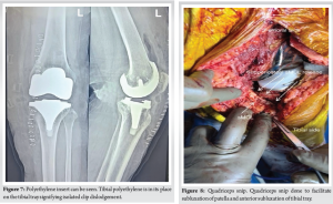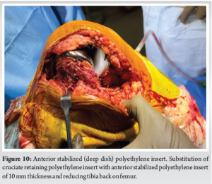 The patient was undertaken for surgery at the earliest possible time, so as to prevent complete perforation of skin and soft-tissue compromise. Medial para-patellar approach through the previous incision was undertaken. Intraoperatively, the locking clip was found to buttonhole through the medial capsule into the subcutaneous tissue (Fig. 6). The polyethylene insert was in its place (Fig. 7) on the tibial baseplate without any evidence of subluxation. The flexion and extension gaps were assessed and were found to be well balanced. The polyethylene insert was removed after subluxating Tibia and no significant wear was seen on either surface. Subluxation of tibia was facilitated by removing the posterior cruciate ligament, performing a quadriceps snip (Fig. 8) and subperiosteal release of anterior portion of superficial medial collateral ligament (Fig. 9) [3]. The CR polyethylene insert was removed and replaced with an anterior stabilizing or deep dish polyethylene insert of 10 mm (Fig. 9-11). Standard post-operative closure was performed. The post-operative course was uneventful with patient achieving full ROM at 1 week without any extension lag. Intraoperatively, samples were collected and sent for culture sensitivity which tested negative.