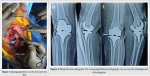 There are two types of locking mechanisms of polyethylene onto the tibial baseplate, peripheral and central, using a tongue-in-groove or Dovetail mechanism [4,5]. The Zimmer Biomet Vanguard knee involves central dovetail locking mechanism which compresses the polyethylene bearing against the tray by utilizing an oversized titanium locking bar that forces the bearing against a 10° posterior boss [1]. The proposed advantage of this mechanism is that it allows for maintained thickness of the polyethylene insert on the peripheries, as the locking mechanism is kept anteriorly within the intercondylar area [1]. To the best of our knowledge, only one such case has been reported of the failure of locking bar mechanism in a case of CR design of TKR prosthesis [2]. All other case reports of failure of locking mechanism have been reported in constrained knees or posterior stabilized knees [6-10]. This is considered because increase in constraintness of a prosthesis has been linked to an increase in micro-motion between the tibial baseplate and polyethylene insert leading to greater, thereby greater the chances of failure of locking mechanism. Locking mechanism failure can lead to subluxation or dissociation of the polyethylene. Two mechanisms are described: Anterior lift-off of the bearing in flexion, resulting in an anterior displacement and posterior lift-off in extension, with a posterior dislocation of the polyethylene [5,10]. Risk factors are malpositioning of the tibial component with anterior slope or varus, flexion–extension mismatch, deficiency of the extensor mechanism, or extensive posterolateral release [7]. These conditions are more often observed in revision knee arthroplasty than in primary total knee arthroplasty [7], hence the higher rates failure of locking mechanism. In our case, there is no evidence to suggest that there was any surgical error in locking of the components, because this failure occurred late in the post-operative period. Evidence from biomechanical models suggests that, if this were the reason, the loose locking bar would have backed out much sooner, as the patient was bearing weight normally in the post-operative period. Furthermore, none of the proposed risk factors were found to be present. The rarity of such an event, especially in the CR designs further makes it difficult to point toward any cause with utmost certainty. The limitation of this report is that the facilities were not available for the analysis of the retrieved polyethylene liner and the lockin bar, so as to rule out any manufacturing defect. The surgeon was an experienced in using vanguard CR prosthesis, thereby eliminating the possibility of any surgical error.