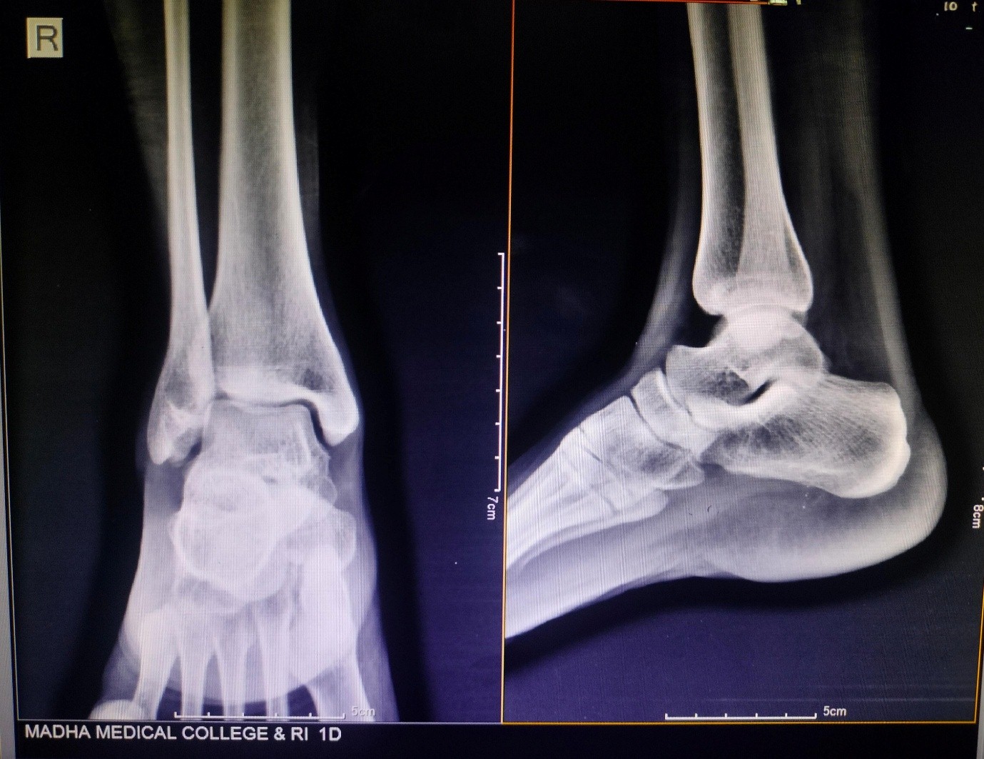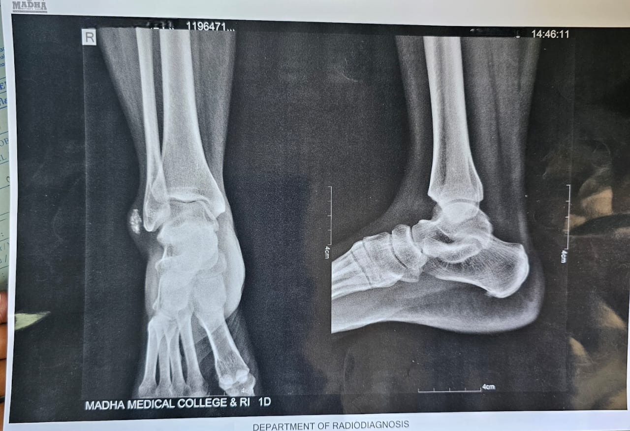 A 42-year-old woman walked into our orthopedic outpatient department complaining of a swelling over the outer side of her right ankle. It had been slowly increasing in size over the past 3 months. She mentioned some discomfort while standing or walking for long periods, but no severe pain. There was no history of trauma, fever, or any systemic illness. She’d never had similar joint issues in the past. On examination, there was a localized swelling around the lateral malleolus, roughly 2 cm across (Fig. 1). It felt soft to firm and was mildly tender to touch. The skin over the area looked normal – no redness, no warmth. Her ankle movements were full, and there were no signs of instability, locking, or crepitus. In short, nothing about the joint itself seemed unusual, except for the presence of this firm, slow-growing lump.