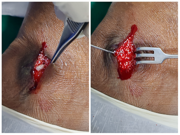 Surgery was done under spinal anesthesia. A small lateral incision was made, and as we dissected through the subcutaneous layers, we came across a firm, well-circumscribed, pale-brown mass (Fig. 3). It was sitting just superficial to the joint capsule, not involving deeper structures. On careful exposure, multiple small white loose bodies – glistening, pearl-like – were seen within the thickened synovial tissue (Fig. 4). The surrounding synovium was clearly hypertrophic and inflamed, probably from chronic irritation. Dissection was done slowly, preserving all nearby tendons and neurovascular structures. The entire mass along with the involved synovium was removed in one piece and sent for histopathology (Fig. 5).The recovery was smooth (Fig 6.)