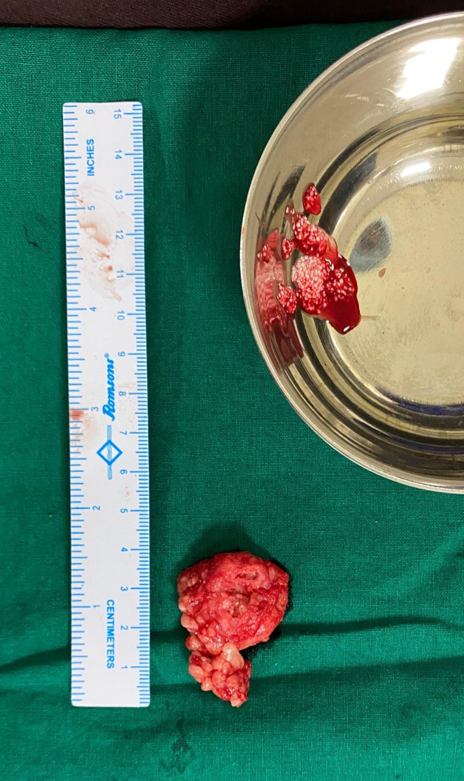 Figure 5: Entire mass along with the involved synovium was removed in one piece and sent histopathology.