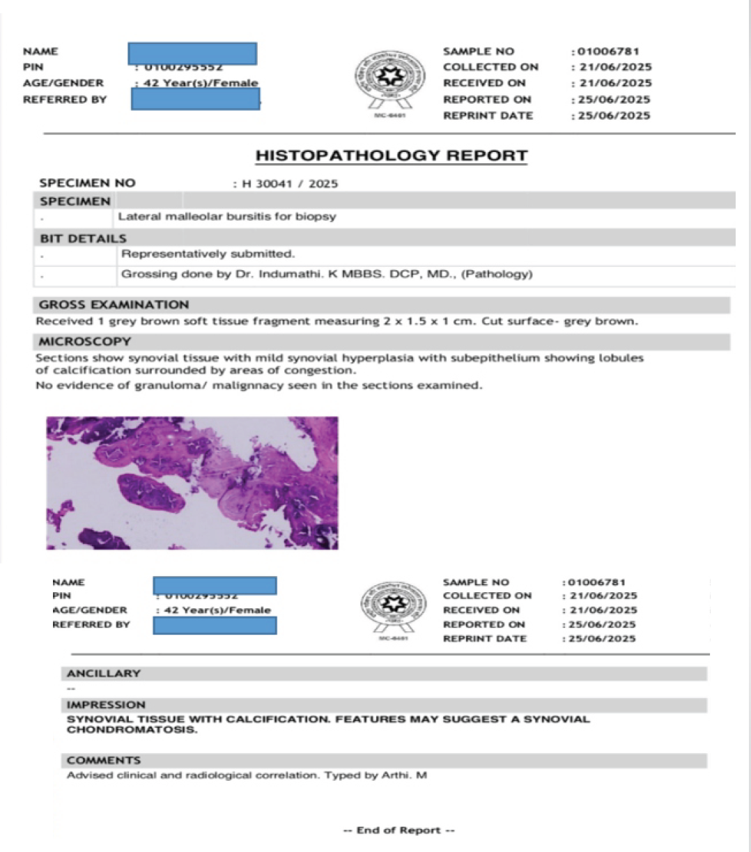 However, when it shows up around the ankle – especially the lateral malleolus – it catches most of us off guard. That’s because it’s incredibly rare, and the signs can easily be mistaken for other, more common conditions, such as a ganglion cyst, bursitis, or even gout [3,4]. Unlike the classic presentations in the knee or hip, where joint pain, swelling, and mechanical symptoms, such as locking are more expected, SC around the ankle often presents quietly, just a subtle swelling, sometimes with minimal discomfort [4,5]. Standard X-rays may sometimes give it away, especially if the loose bodies have calcified [4]. However, in cases where nothing obvious is seen, or where soft-tissue detail matters, magnetic resonance imaging (MRI) becomes a key tool [6]. Even then, diagnosis isn’t complete without histopathology. That’s where you truly confirm it: Spotting those small cartilage nodules and the changes in the synovium under the microscope [7]. This case involves a 42-year-old woman who came in with a gradually developing swelling over her right lateral malleolus. The clinical picture wasn’t dramatic, but imaging and histopathology helped clinch the diagnosis. We’re sharing this case to highlight a condition that, although rare in this region, should still be kept in mind – particularly when the usual suspects don’t add up. Early diagnosis can go a long way in preventing chronic symptoms and recurrence.
