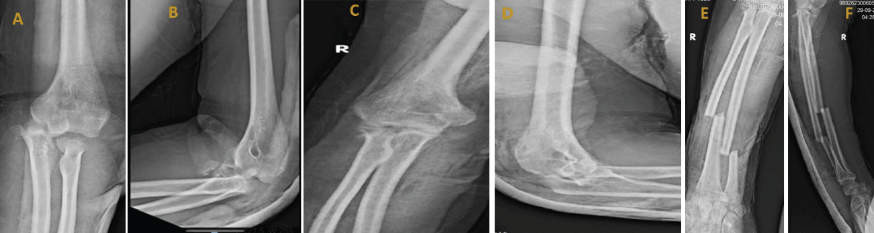 Figure 1: Pre-operative X-rays of left elbow (a) anteroposterior and (b) lateral view, right elbow (c) anteroposterior and (d) lateral view, right forearm (e) anteroposterior and (f) lateral view.
