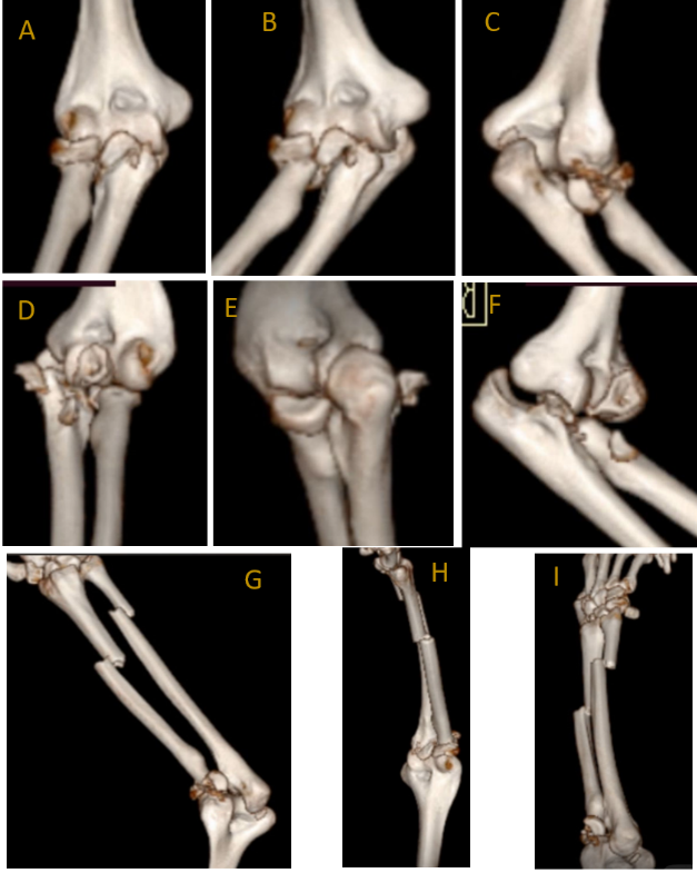 Figure 2: Pre-operative computed tomography scan 3D reconstruction of right elbow (a, b, c) and left elbow (d, e, f), right elbow with forearm (g, h, i).