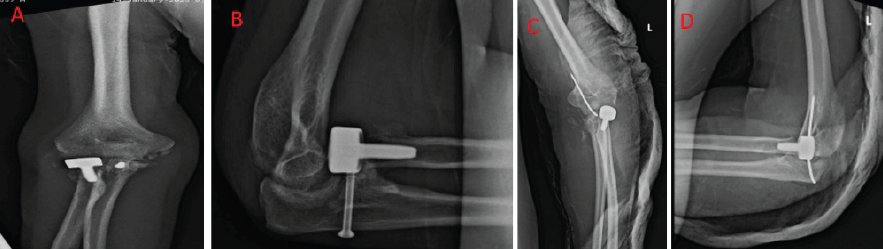 Figure 3: Immediate post-operative X-rays of right elbow (a) anteroposterior and (b) lateral view and left elbow (c) anteroposterior and (d) lateral view