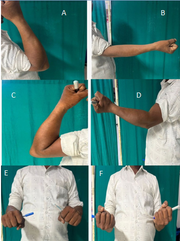 Table 1: Range of motion on the right and left side including flexion/extension, pronation/supination